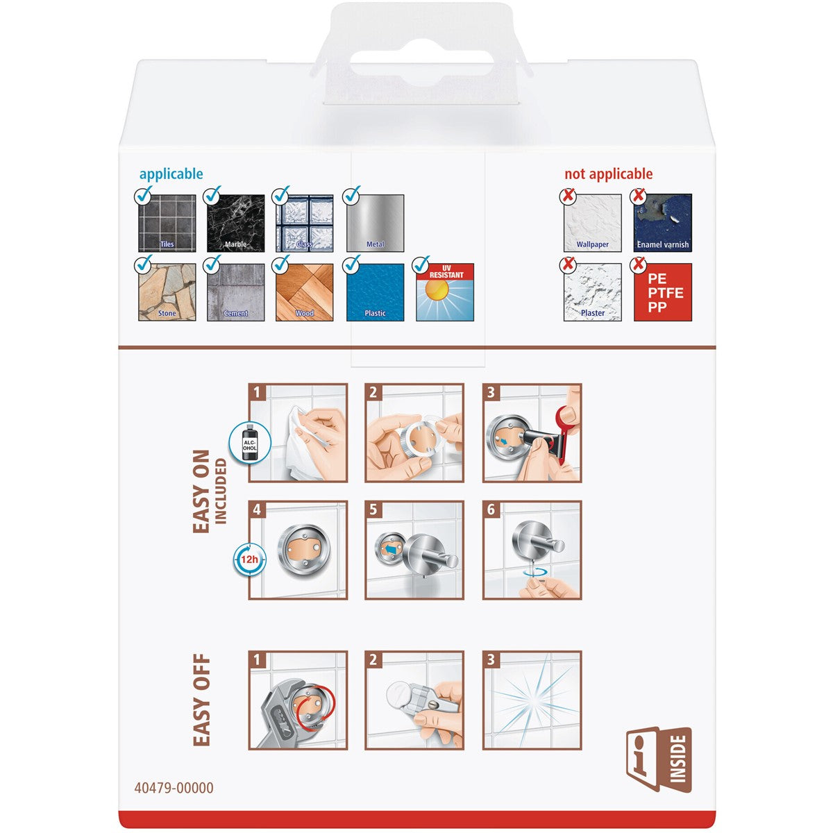 Mit dem tesa® NOOBLESSE Toilettenpapierhalter können Sie Toilettenpapier sicher und optisch ansprechend aufbewahren. Runde Formen und Edelstahloptik bestimmen das Design. Der elegante Deckel verhindert den direkten Blick auf die Papierrolle. Der Toilettenpapierhalter lässt sich ohne Bohren befestigen. Dadurch vermeiden Sie Schäden am Untergrund. Nachdem Sie den Befestigungsadapter angebracht und mit der Klebmasse gefüllt haben, warten Sie 12 Stunden und können den Toilettenpapierhalter dauerhaft sicher anbringen. Trotz der hohen Haltekraft können Sie ihn jederzeit wieder entfernen und mit einem neuen Adapter (BK20) wiederverwenden. tesa.Power.Kit Glue: Achtung! Bei der Verwendung kann gefährlicher lungengängiger Staub entstehen. Staub nicht einatmen.